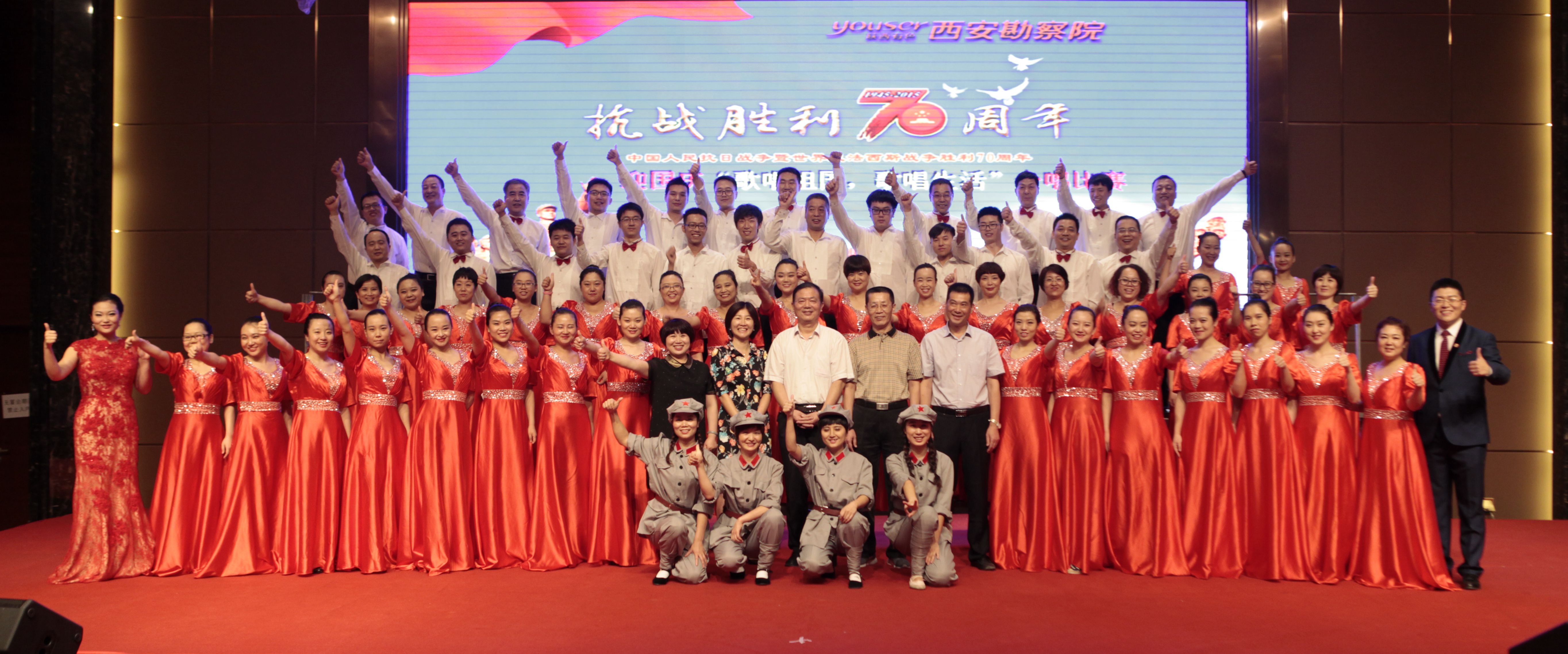 在曲江國際飯店的永寧大廳里,西勘院領導與500余名職工一同觀看了這次比賽。每個隊伍都準備充足,拿出最佳水平,向祖國抗戰勝利七十周年獻禮。我公司選擇了《紅軍不怕遠征難》和《走向復興》兩首歌曲,組織了有公司領導、職能部門負責人和員工60多人參加的合唱隊,經過一個多月的用心準備,大家克服了工作和排練時間上的沖突,聽從排練老師的指揮,每一次都有進步和收獲,最終贏得了比賽的勝利。
