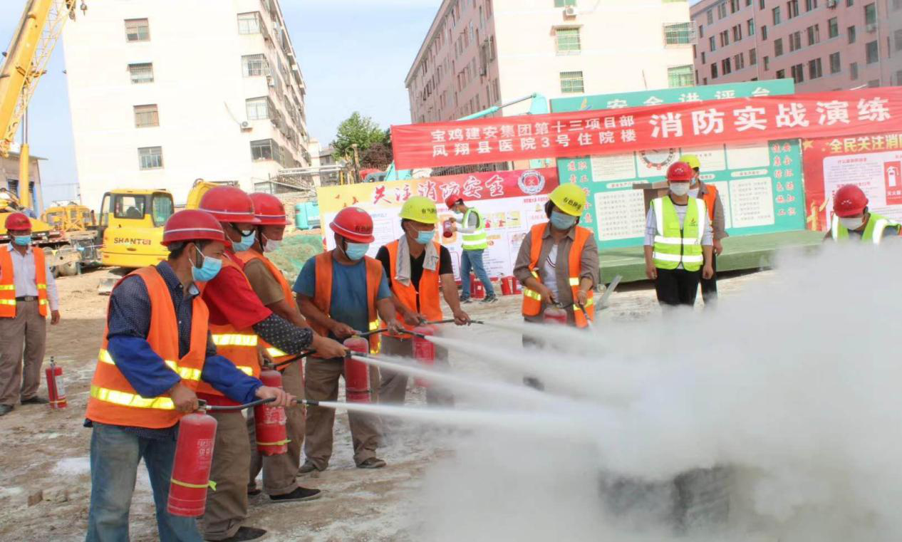 2020年6月是全國第19個“安全生產月”,為進一步加強項目安全管理工作,強化消防安全意識,認真貫徹”安全第一、預防為主、綜合治理”的方針,全面落實安全生產主體責任,牢固樹立保安全就是保穩定、保安全就是促發展的重要思想,有色陜建第二工程公司在鳳翔縣醫院項目部組織開展模擬消防安全演練活動。本次演練以模擬火災發生后的組織滅火救援為主要內容,鳳翔縣消防支隊、鳳翔縣縣公安局、縣醫院醫護人員、公司項目全體參建人員,項目其他建設單位300多人參加了此次演練活動。